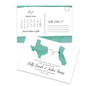 Wedding destination save the date postcard idea that you can customize for your special day. We can do any of the fifty states of America without additional charges. The state map will always be in the emerald green watercolor style. On the backside of your postcard, we added a calendar that you can also personalize.