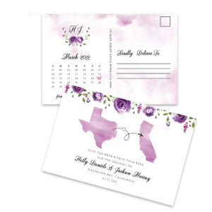 Custom purple save the date postcards featuring watercolor florals. For this design, we added your home state and wedding location state, making this a perfect option for destinations wedding. We can do any of the fifty states of America in the same watercolor style. On the other side, customize the calendar to reflect your wedding date and add your return address.